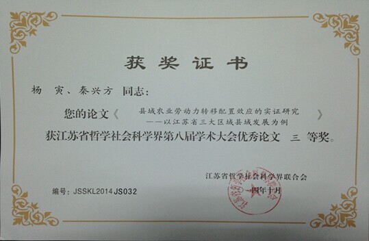 据扬州社科联网站报道:12月16日上午,江苏省哲学社会科学界第八届学术大会苏中片区分会在扬州召开。江苏省社科联党组副书记、副主席汪兴国,扬州市委常委、宣传部部长卢桂平,扬州大学副校长、苏中发展研究院理事会副理事长刘祖汉出席会议。来自南通、泰州、扬州三市的论文作者代表及扬州市社科类学会代表参加会议。本次分会共收到论文近500篇,入选大会60篇,其中评出优秀论文36篇。竞博官网青年教师杨寅报送的研究成果《县域农业劳动力转移配置效应的实证研究——以江苏省三大区域县域发展为例》荣获大会优秀论文三等奖。