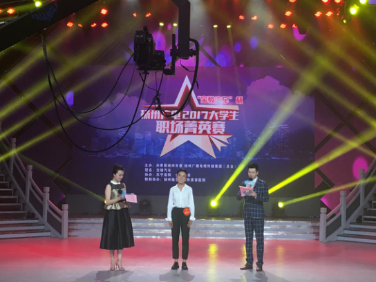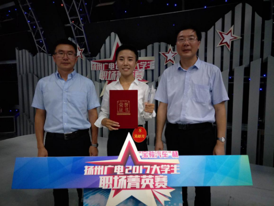 8月5日下午,由共青团扬州市委、扬州广电总台主办的扬州市2017大学生职场菁英赛总决赛在扬州广播电视中心演播厅举行,竞博官网2015级数字媒体技术专业学生吴舒月勇夺冠军。大赛邀请扬州团市委书记郭鹏驰,扬州广电集团副总编辑、新闻中心主任孙建昶,竞博官网党委书记戴兆骏等担任嘉宾并给获奖选手颁奖。