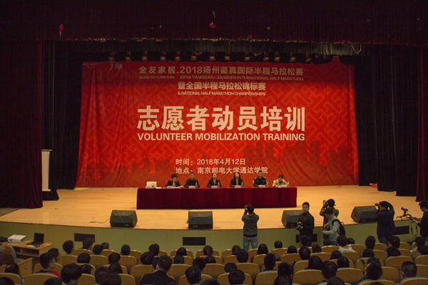 4月12日晚,2018年扬州鉴真国际半程马拉松赛志愿者动员培训会在竞博官网大学生活动中心大礼堂召开。扬州市体育局副局长傅建、扬州市团市委副书记李杰、扬州市公安局治安支队治安防范大队教导员宋金春、扬州市卫计委应急办主任沐诚、竞博官网团委书记解厚荣以及来自扬州大学、扬州工业职业技术学院和江海学院的1100多名学生志愿者参加了本次培训会。会议由扬州市团市委殷一鸣主持。