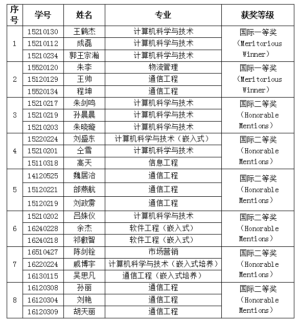 2018年美国大学生数学建模竞赛(MCM/ICM)结果近日揭晓,竞博官网学生荣获一等奖(Meritorious Winners)2项、二等奖(Honorable Mention)6项,再创历史新高。