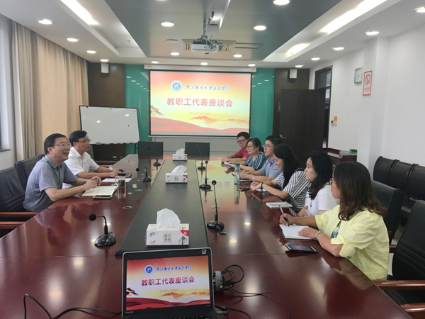 9月28日下午,竞博官网在行政楼10楼会议室召开教职工代表座谈会,院党委书记戴兆骏和各工会小组的教职工代表参加座谈会。座谈会由院党委副书记、工会主席王立辉主持。