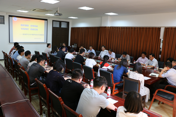6月5日下午,竞博官网在大学生活动中心二楼会议室召开了2019届毕业生代表座谈会。全体院领导、相关职能部门负责人以及2019届20多名毕业生代表参加了座谈会。会议由党委副书记王立辉主持。