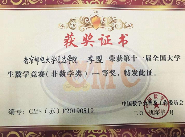 近日,第十一届全国大学生数学竞赛组委会寄来获奖证书,竞博官网学子喜获第十一届全国大学生数学竞赛(江苏赛区)非数学专业组别一等奖1项、二等奖4项,三等奖15项,获奖率达44%。这是继竞博官网在2019年6月江苏省高等学校第十六届高等数学竞赛中荣获21项一等奖、19项二等奖和11项三等奖之后的又一殊荣,也是竞博官网首次选派学生参加全国大学生数学竞赛。