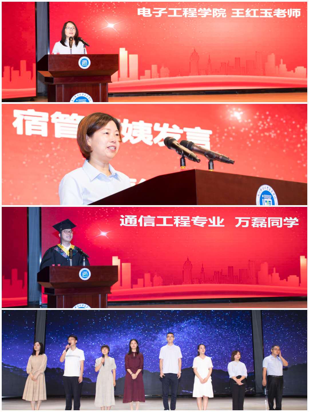 毕业典礼上,教师代表王红玉、宿舍管理员代表王丽红、学生代表万磊、全体毕业班辅导员分别给毕业生们送上了祝福。