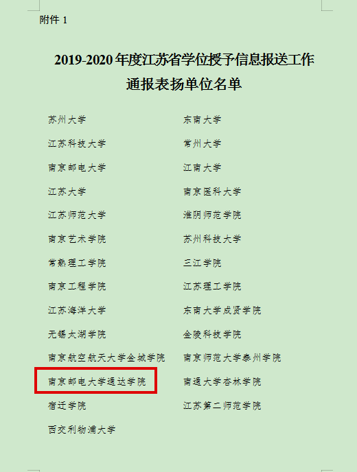 近日,江苏省学位委员会办公室发布了《关于通报2019-2020年度江苏省学位授予信息报送工作情况的通知》,竞博官网荣获“2019-2020年度省学位授予信息报送工作先进单位”,教务处司艺老师获评“2019-2020年度江苏省学位授予信息报送工作先进个人”。
