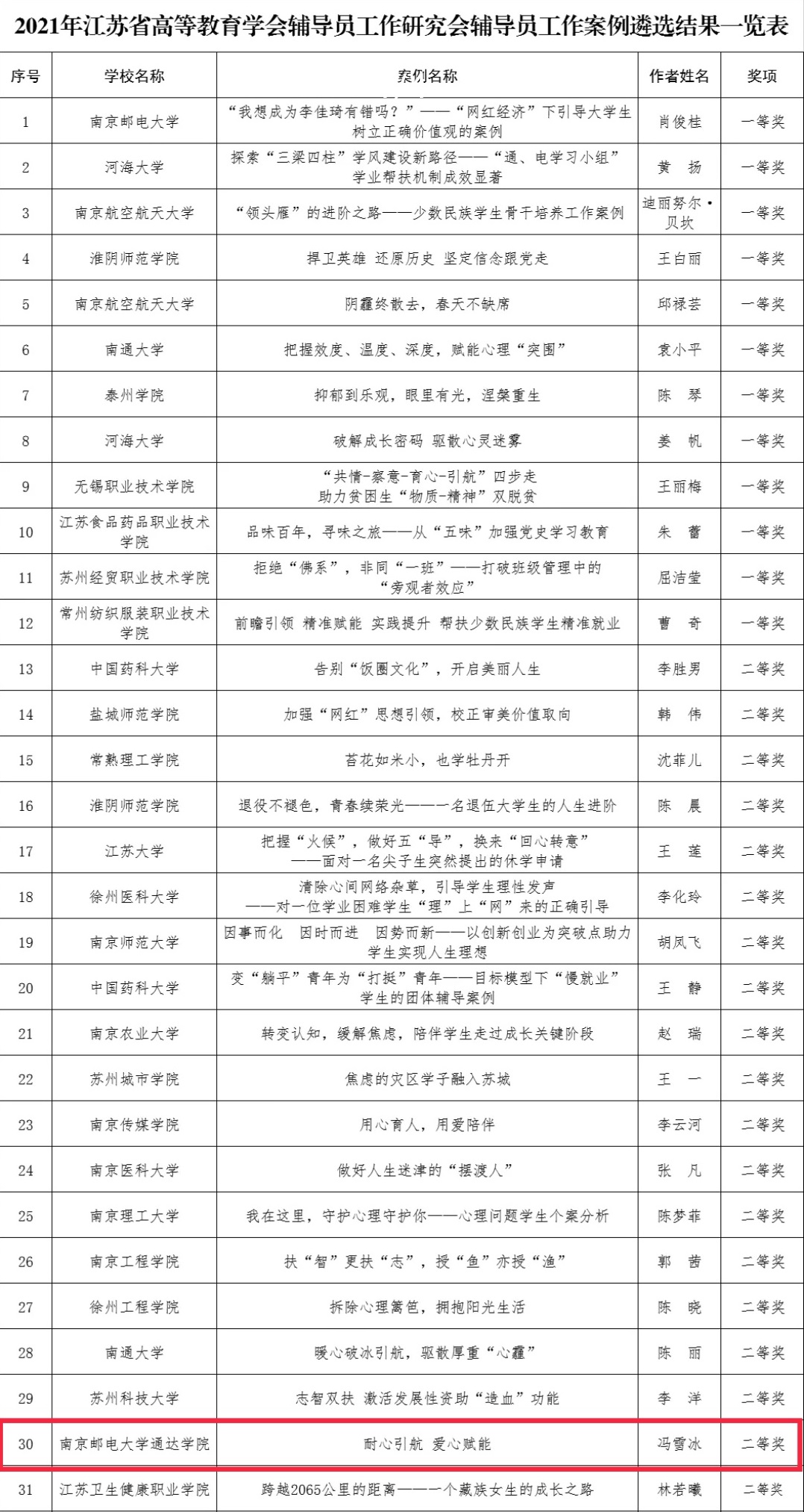 近日,江苏省高等教育学会辅导员工作研究委员会发布了《2021年江苏省高等教育学会辅导员工作研究委员会辅导员工作案例遴选结果》,竞博官网辅导员冯雪冰老师撰写的《耐心引航 爱心赋能》工作案例荣获二等奖。竞博官网是本届唯一获得二等奖的独立学院,创历史最好成绩。