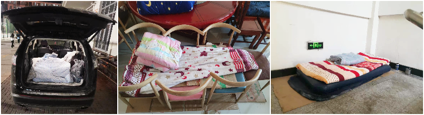 学院封闭管理一声令下,食堂员工闻令而动,默默逆行,舍小家为大家,为这场特殊的“战役”,贡献着餐饮人的力量!为确保食品安全、生产安全,为了尽全力满足师生“舌尖上的需求”,160多名员工选择无条件坚守食堂,他们没有AB岗轮换,静待疫散花开;没有员工宿舍,就集体住双创中心、住食堂大厅,没有床铺,就睡气垫,没有气垫就临时用凳子拼搭成“小床”,还有的就睡在自己的汽车里。