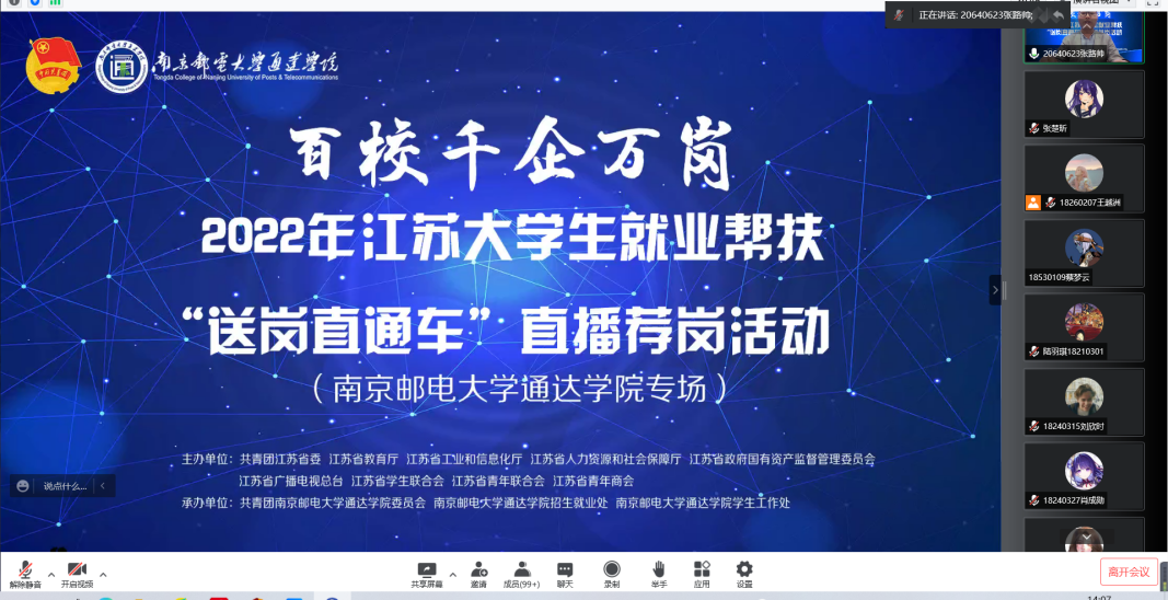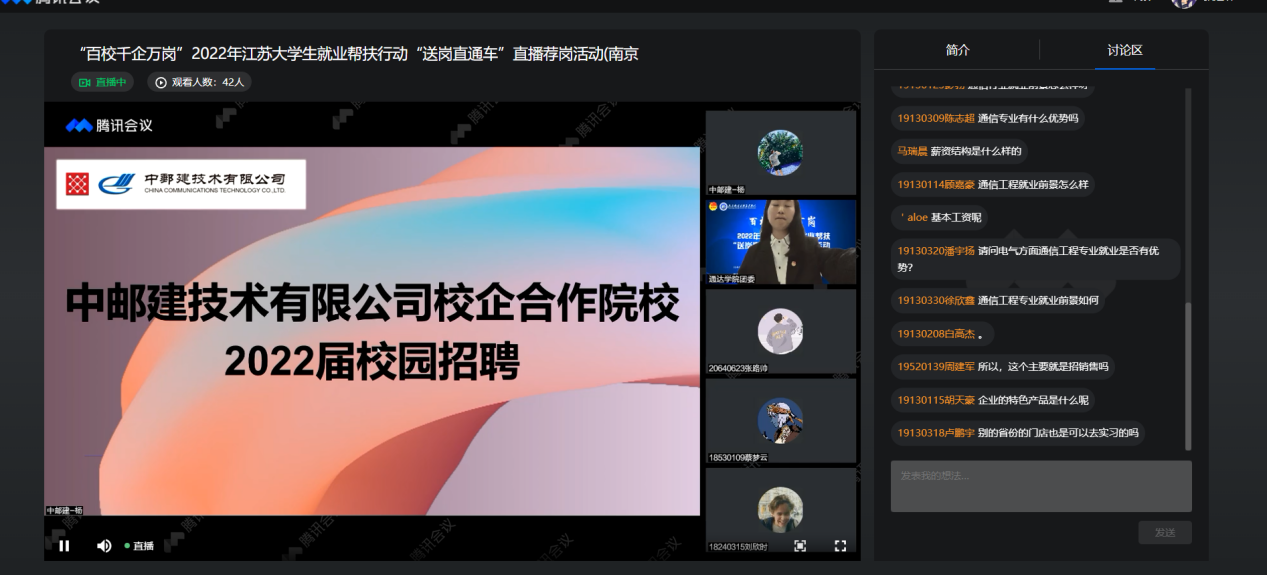 为深入贯彻习近平总书记关于做好“六稳”“六保”工作重要指示精神,紧密围绕稳就业工作大局,推进疫情防控常态化下毕业生的就业服务工作,由团省委、省教育厅、省工信厅、省人社厅、省政国委、省广电总台、省学联、省青联、省青商会主办,竞博官网团委、招就处、学工处承办的“百校千企万岗”2022年江苏大学生就业帮扶行动“送岗直通车”直播荐岗活动(jbo竞博官网登录专场),5月11日在竞博官网就业大厅成功举办。竞博官网800余名应届毕业生通过腾讯会议、腾讯直播线上参与此次活动。