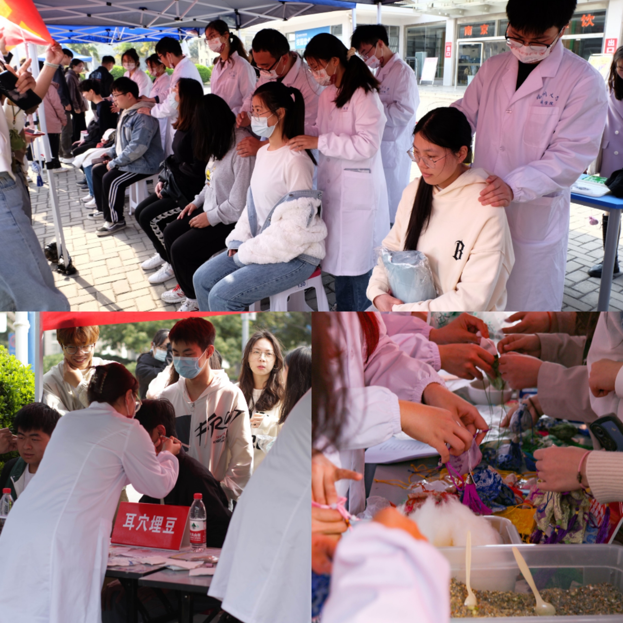 活动中,扬大医学院的学生们利用所学专业知识,通过按摩肌肉帮助竞博官网师生们舒缓疲劳、放松解压;通过耳穴埋豆,用胶布把药豆固定在耳朵相应的穴位上反复按揉,帮助体验者改善睡眠质量。在工作人员的指导下,参与活动的师生还亲手制作了养心安神的中药香囊。精心的活动设计、贴心的助眠小礼品吸引了近千名师生驻足观看、积极参与。