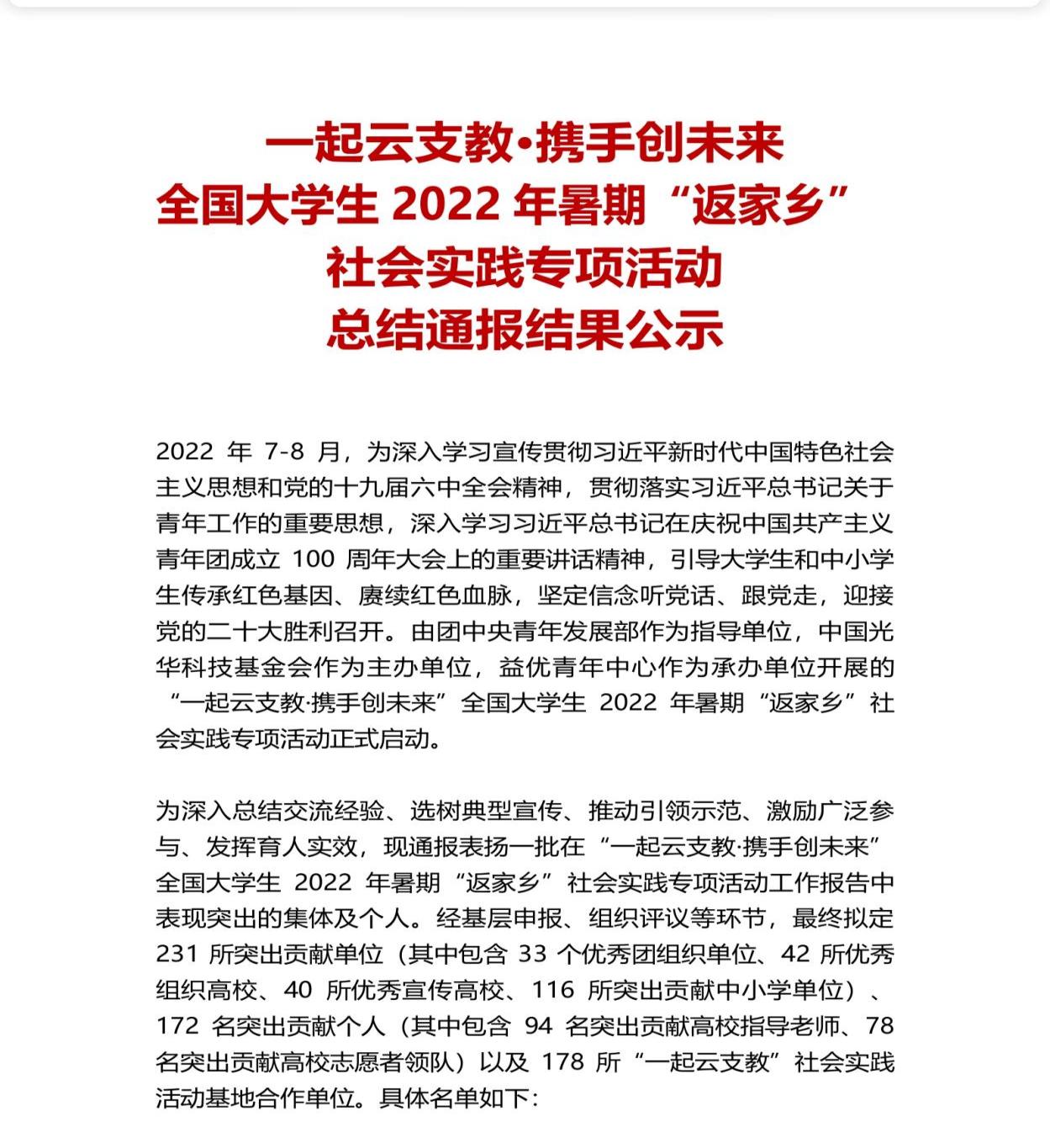 近日,由团中央青年发展部指导,中国光华科技基金会主办的全国大学生2022年暑期“返家乡”社会实践“一起云支教·携手创未来”专项活动总结通报结果公布,竞博官网被确立为“一起云支教”社会实践活动基地合作单位。中国光华科技基金会发来感谢信,对竞博官网充分动员、积极组织志愿者参与“一起云支教携手创未来”线上支教活动表示感谢。