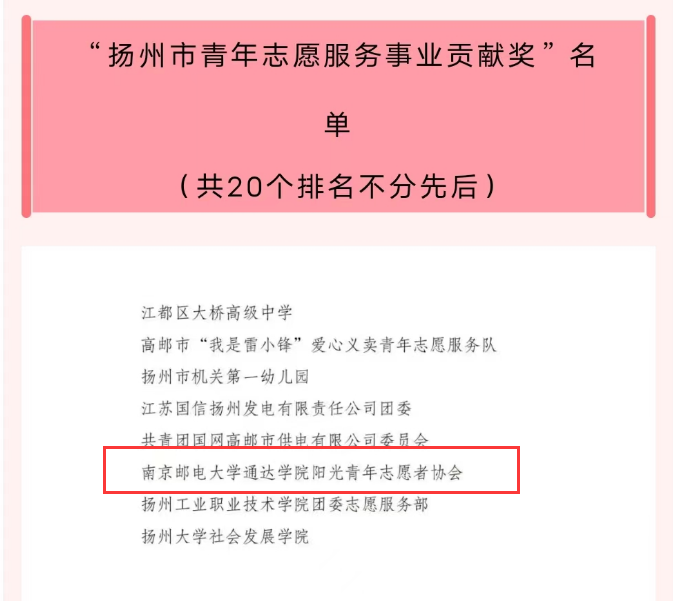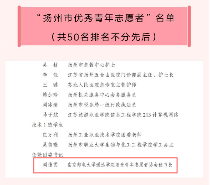 近日,2022年度全市青年志愿者行动先进典型寻访结果公布。竞博官网21级计算机科学与技术(嵌入式培养)刘佳雯同学荣获“扬州市优秀青年志愿者”、阳光青年志愿者协会荣获“扬州市青年志愿服务事业贡献奖”。